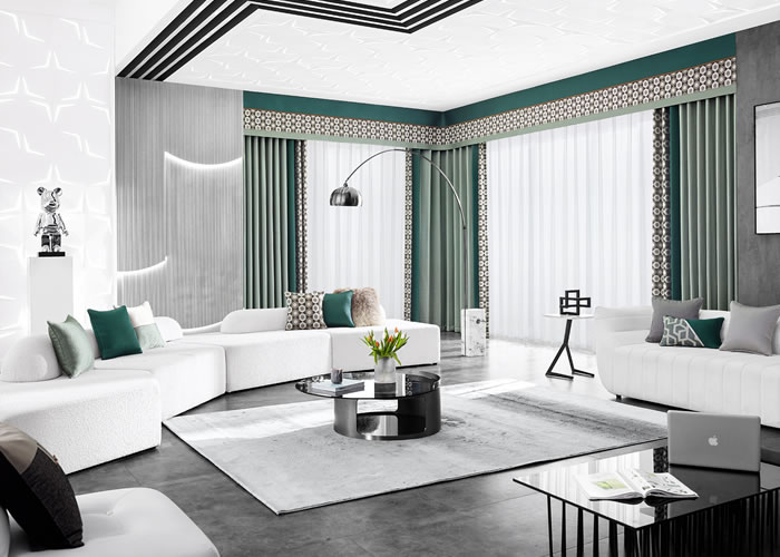 客廳是家中的活動中心,平日里接待親朋好友、家人娛樂,因而客廳的窗簾要大氣美觀,應追求一種環境的素雅大方、寬敞和光線明亮。色彩盡量與地板、墻壁、家私等相協調,可以采用中間色調。款式上多見懸掛、對開、落地式樣,外簾飾窗紗、里簾采用半透明的窗簾效果好,配以窗幔,附以窗櫻、飾帶等進一步修飾,效果會更好。